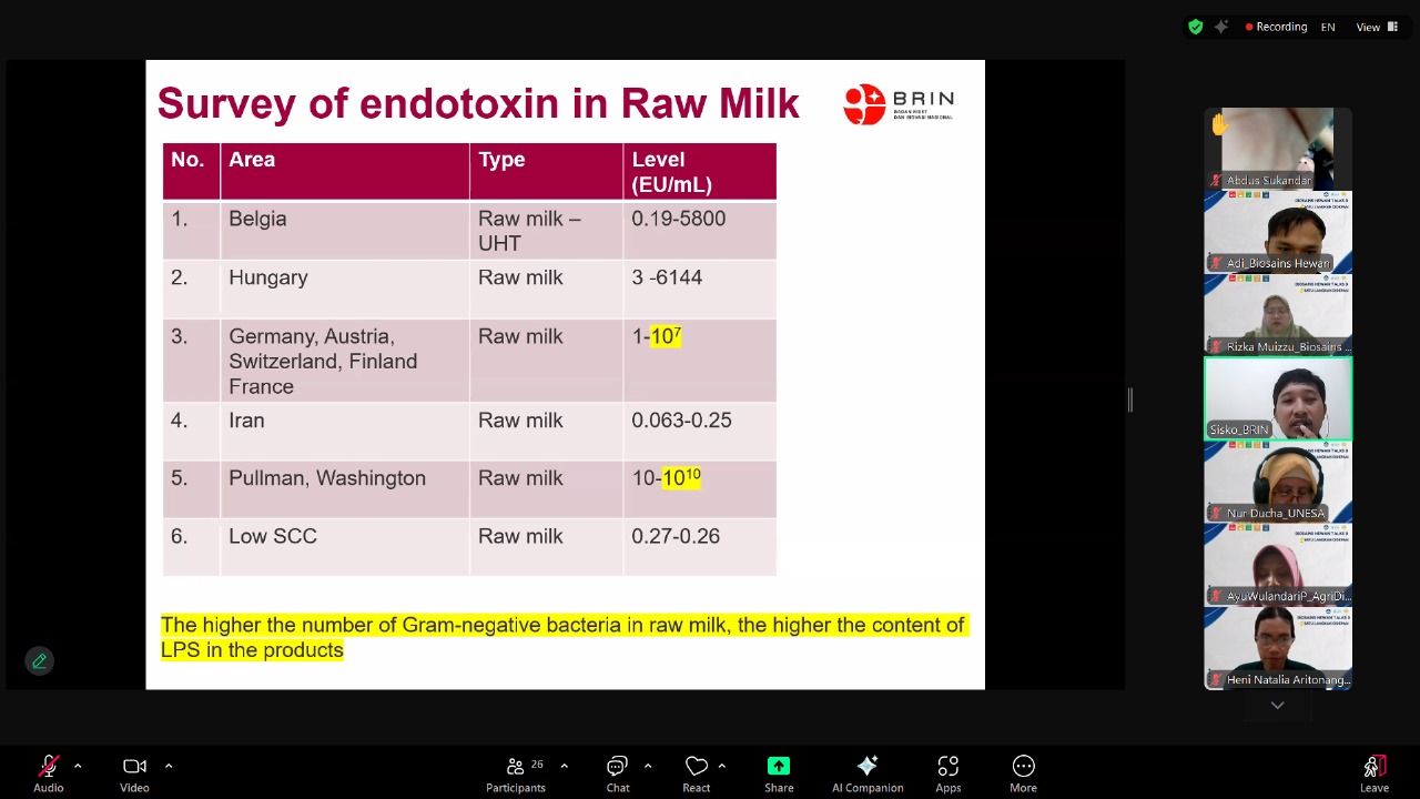 Acara webinar ini dibuka oleh Dekan Fakultas Ketahanan Pangan Prof. Nining Widyah Kusnanik, S.Pd., M.Appl. Sc. Narasumber yang dihadirkan pada seminar ini yaitu Siska Aditya, S.Pt., M.Anim.Sc., Ph.D. yang berasal dari BRIN. Materi yang disampaikan bagaimana endotoksin, senyawa toksik yang berasal dari dinding sel bakteri gram-negatif dapat mempengaruhi kesehatan ternak, menurunkan kualitas susu, serta membahayakan keamanan pangan secara keseluruhan. Kegiatan ini merupakan langkah awal dalam mengenalkan civitas akademika FKP kepada masyarakat luas dan menjalin kerjasama dengan BRIN.
